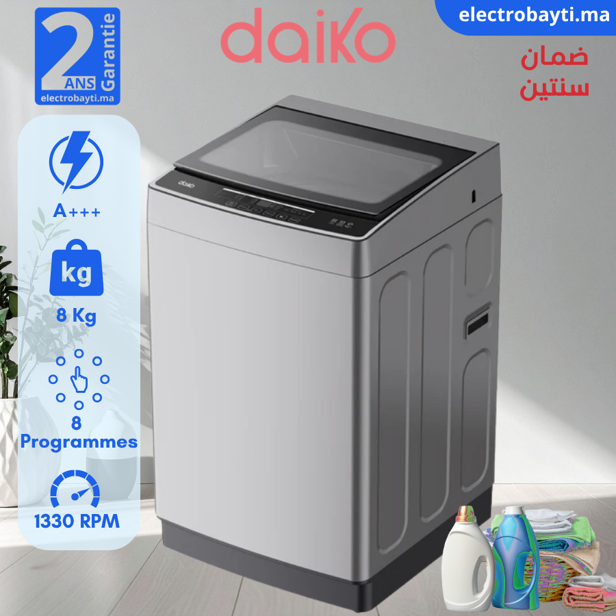 Daiko Machine à laver – chargement par le haut – 8 KG – 8 Programmes – A+++