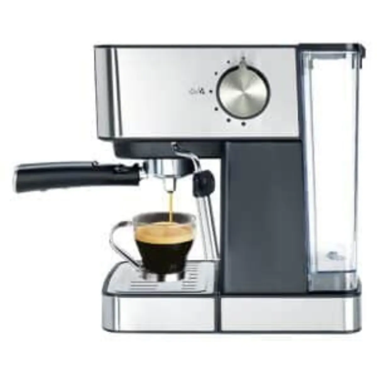 Conçue en acier inoxydable de haute qualité avec une finition inox brossé et noir, elle allie élégance et robustesse. Son réservoir amovible de 1,6 L offre une grande capacité, idéale pour un usage quotidien. Elle est équipée d’un porte-filtre avec filtres pour une ou deux tasses, d’une buse de moussage amovible pour préparer cappuccinos et latte, ainsi que d’un plateau chauffe-tasses pratique.