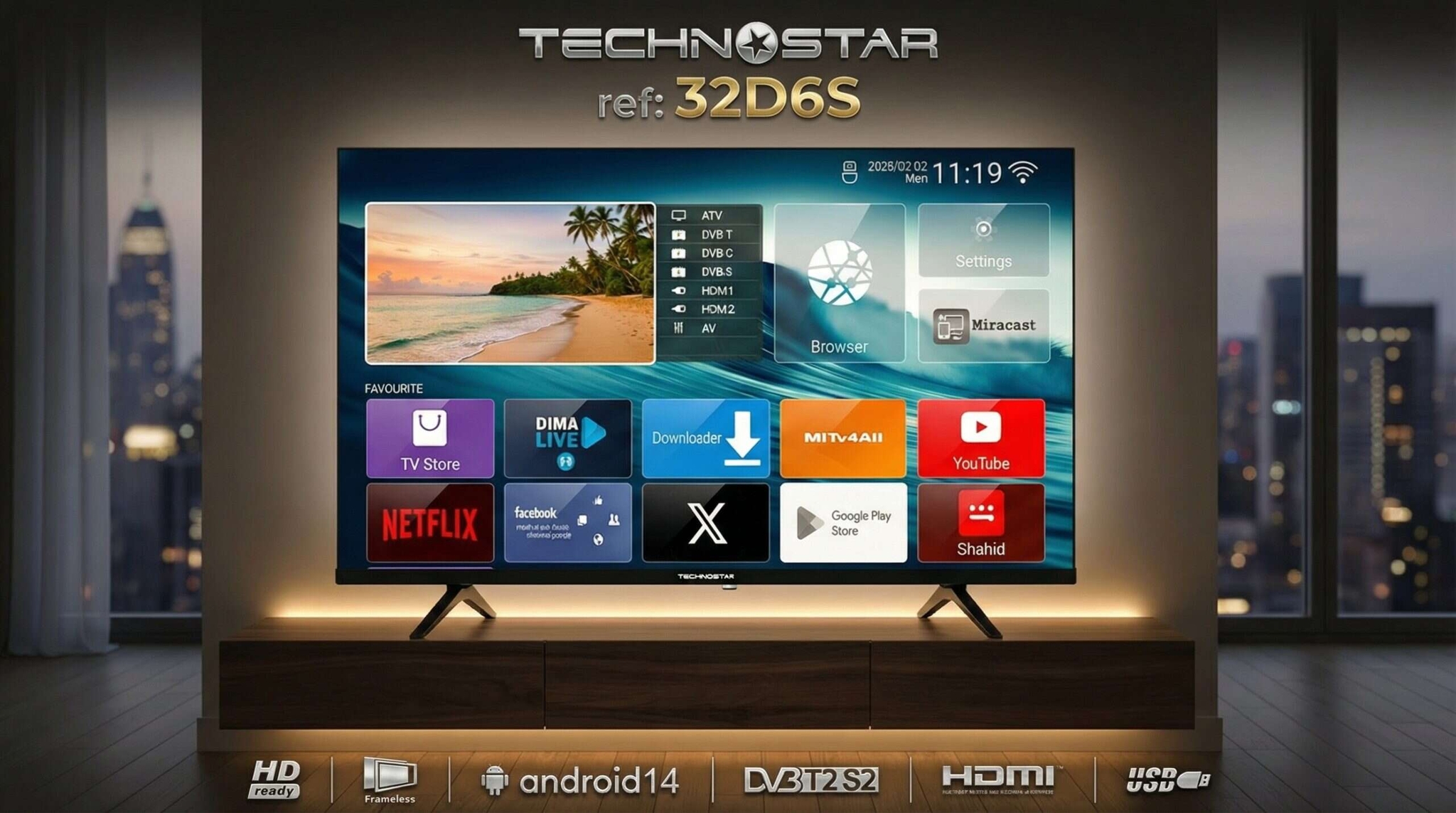 Le modèle Technostar 32D6S se présente comme une solution visuelle moderne alliant technologie récente et design compact. Fonctionnant sous Android 14, ce téléviseur va au-delà d’un simple écran pour devenir un véritable centre de divertissement. Son design frameless, sans bordures, renforce l’immersion et apporte une touche élégante à votre espace.